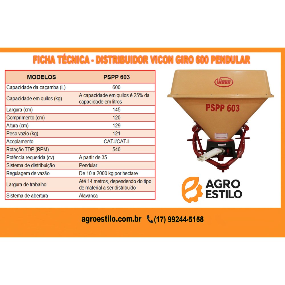 Modelo: PSPP 603 com sistema de distribuição pendular, ideal para distribuição uniforme e eficiente do material. vicon.com.br