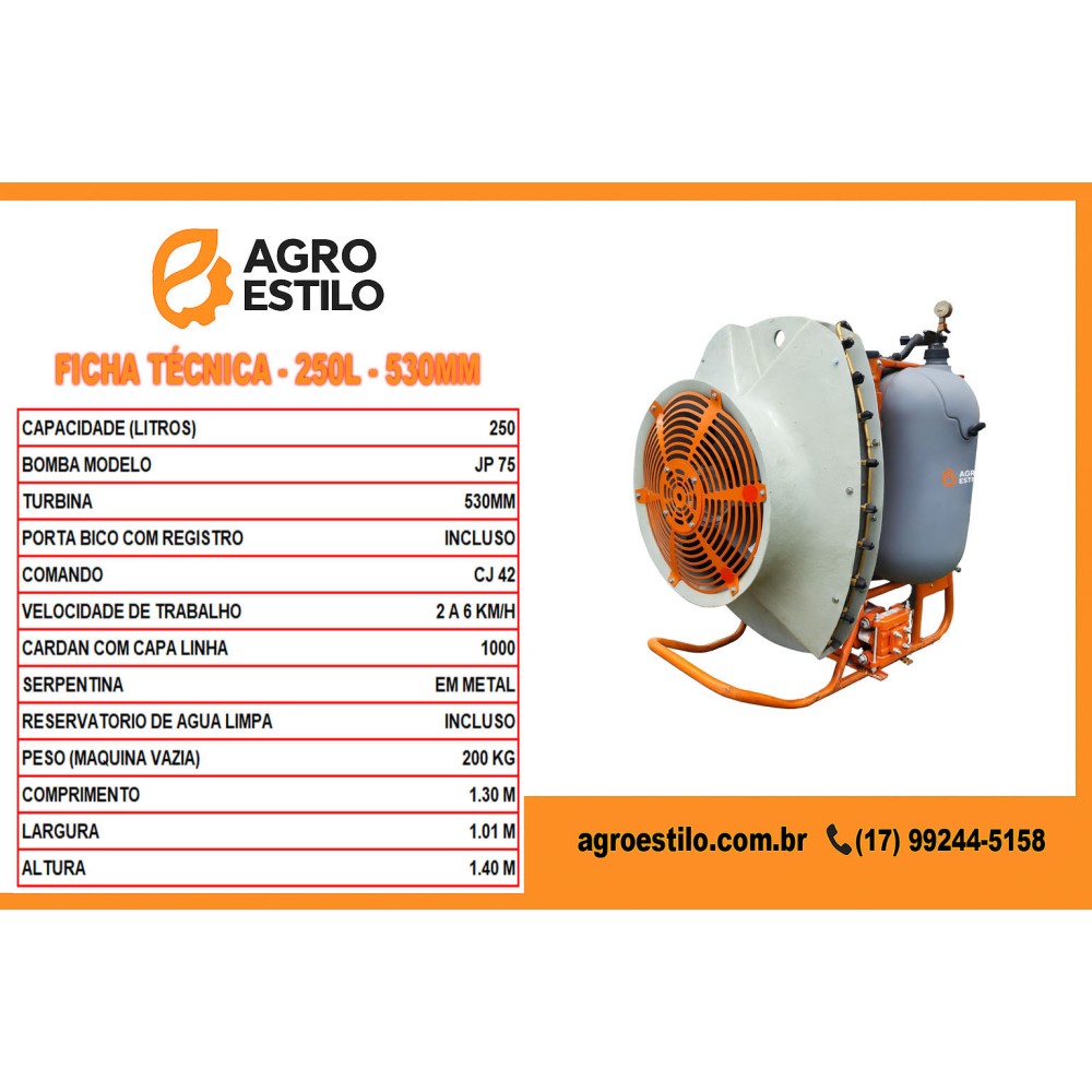 Palavras-chave: Atomizador 250 litros Agro Estilo, atomizador agrícola pequeno, atomizador JP 75, atomizador com turbina 530mm, atomizador com serpentina 9 bicos, atomizador Agro Estilo Brasil.