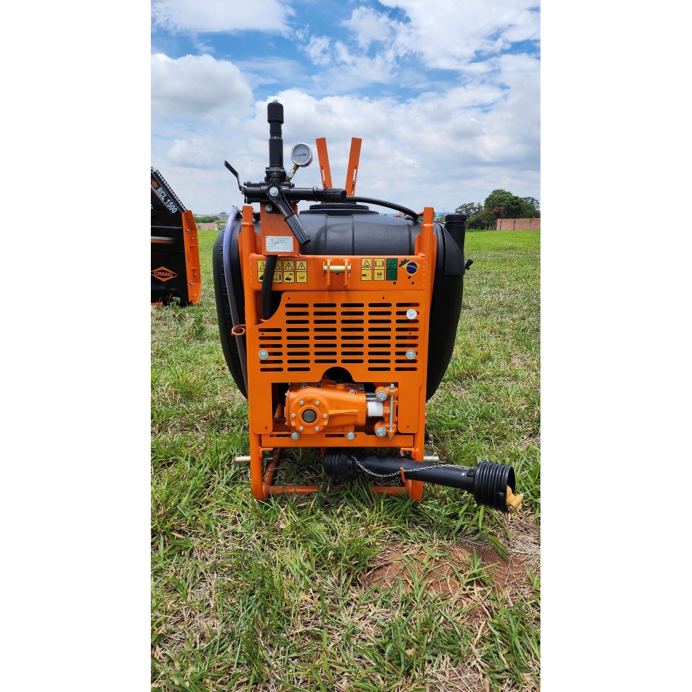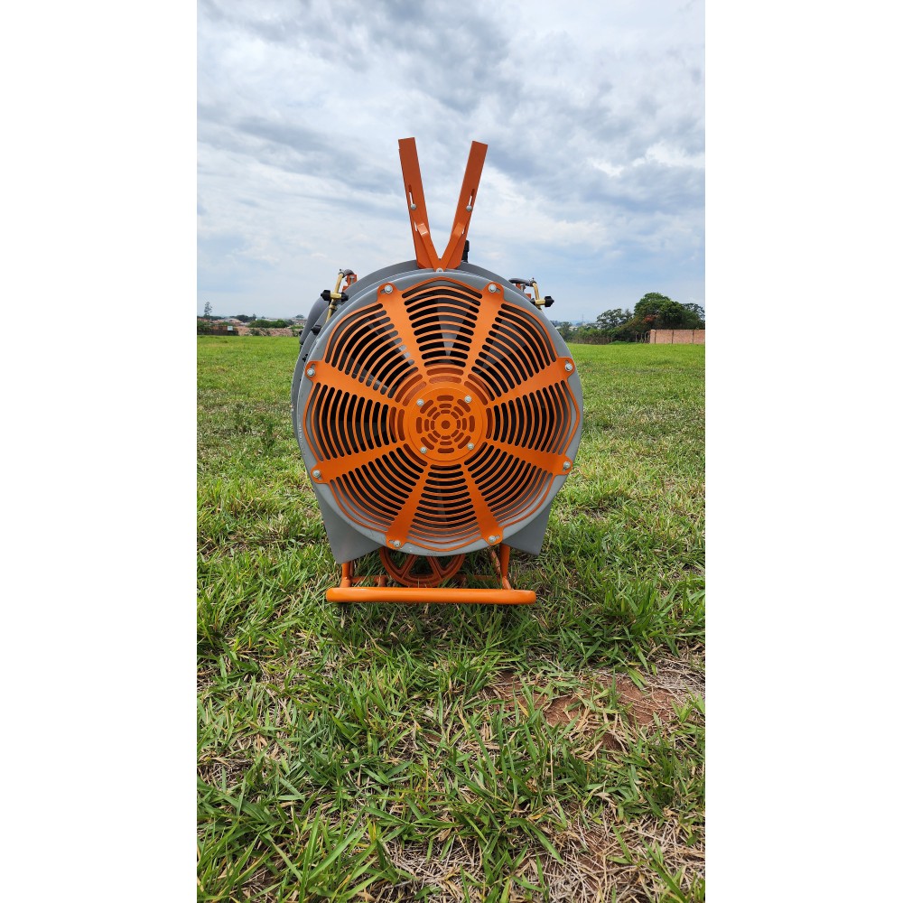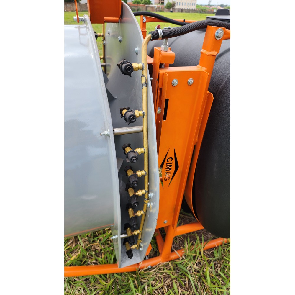 O sistema de pulverização conta com turbina de 725 mm, hélice de 725 mm com 10 pás e serpentinas com 8 bicos de cada lado, garantindo uma pulverização uniforme e de alta eficiência. Além disso, o kit reabastecedor completo e os porta-bicos com registro individual facilitam a operação e a manutenção do equipamento.