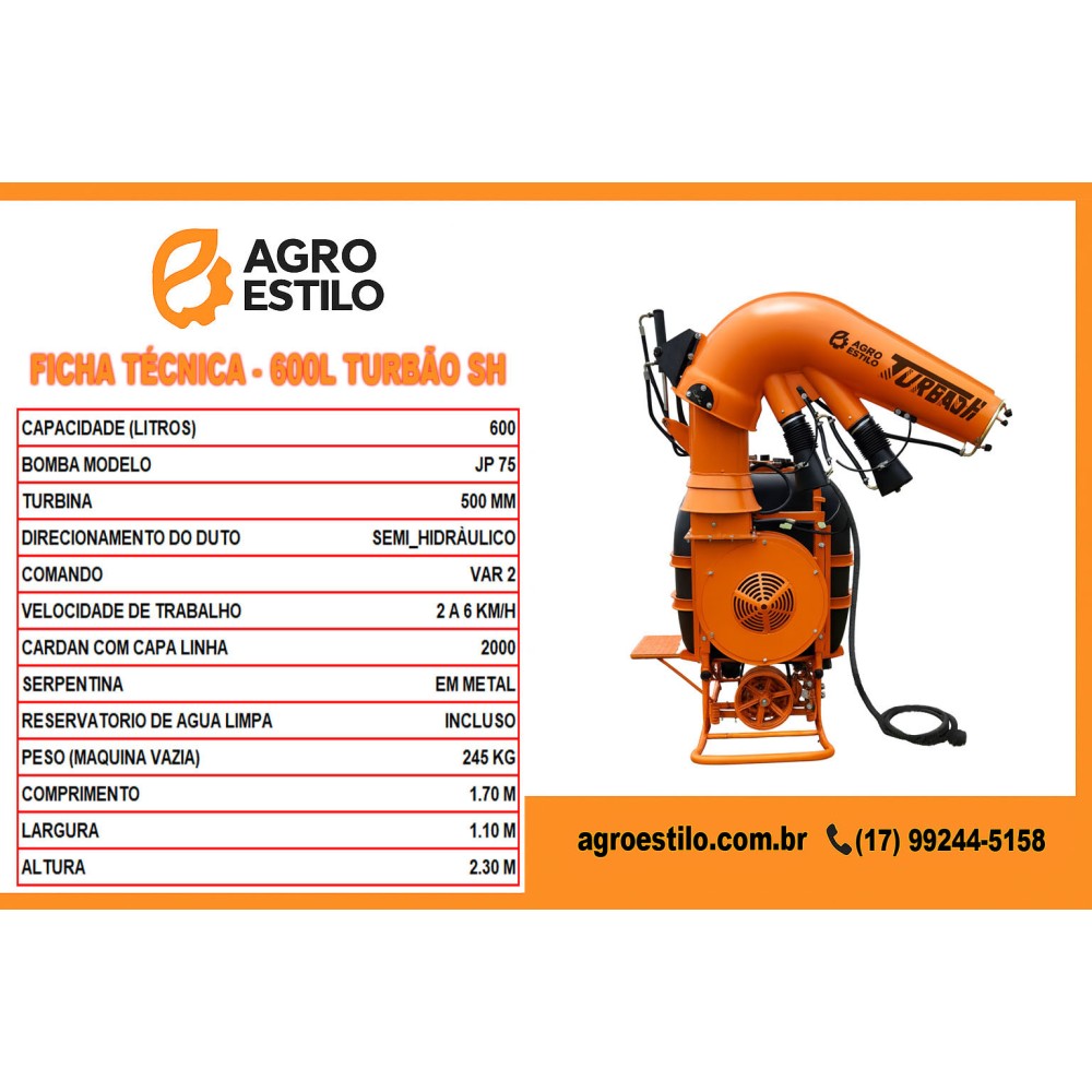 A turbina e hélice centrífuga em aço carbono proporcionam excelente fluxo de ar e distribuição uniforme da calda, enquanto os bicos cerâmicos e a serpentina em latão anticorrosivo asseguram resistência e desempenho superior mesmo nas condições mais exigentes. O direcionamento do duto semi-hidráulico facilita o ajuste e melhora a aplicação, tornando este modelo uma solução completa para pequenas e médias propriedades.