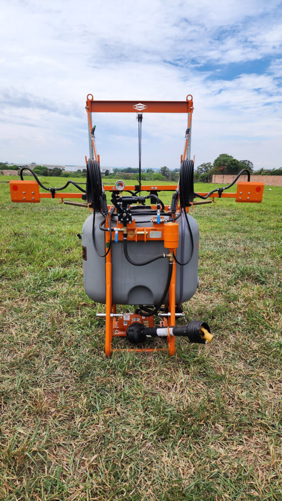 O equipamento possui cardan linha 1000 com capa protetora, kit reabastecedor, filtro de sucção e filtro de linha, além de 2 kits de pistola de catação para serviços complementares. A barra com regulagem de altura manual permite ajustar facilmente a distância de pulverização conforme a necessidade do terreno.